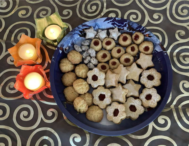 Da warten im kühlsten Raum bunte Metalldosen, aus denen von Zeit zu Zeit Kekse hervorgeholt werden (die bekanntlich im Advent, also vor Weihnachten, am besten schmecken 😉); Papierrollen mit Sterndekor tauchen auf, die man das ganze Jahr über sonst nicht sieht; gefüllte Papiertaschen verschwinden in irgendwelchen geheimen Fächern, vielleicht mit Geschenken?; Schachteln werden herbeigeschleppt, was ist da drin? Die Figuren der Weihnachtskrippe, an die man seit fast einem Jahr nicht mehr gedacht hat, und die doch so vertraut sind …